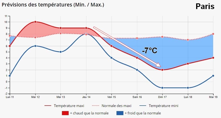 Ainsi, le retour des températures de saison ne sera que très temporaire avec un froid s’annonçant de nouveau marqué dès le week-end et ce jusqu’en cours de semaine suivante. Certaines régions de l’Est et du Nord-Est du pays pourraient retrouver des journées sans dégel alors que les températures maximales perdraient entre 5 et 10°C suivant les régions.
