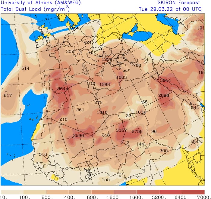 Quantités de poussières de sable dans l'atmosphère au mardi 29 mars 2022 - carte SKIRON