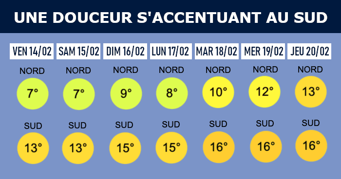 Dans le sud, les températures sont déjà printanières avant même la Saint-Valentin. Cette fin de semaine va rester fraîche au nord mais douce dans le sud, particulièrement dans les régions du sud-ouest. La douceur devrait s'accentuer la semaine prochaine en envahissant les régions du nord. En Aquitaine, on pourra dépasser fréquemment les 20°C, notamment dans le sud de la région. Ces prévisions commencent bel et bien à sentir le printemps...
