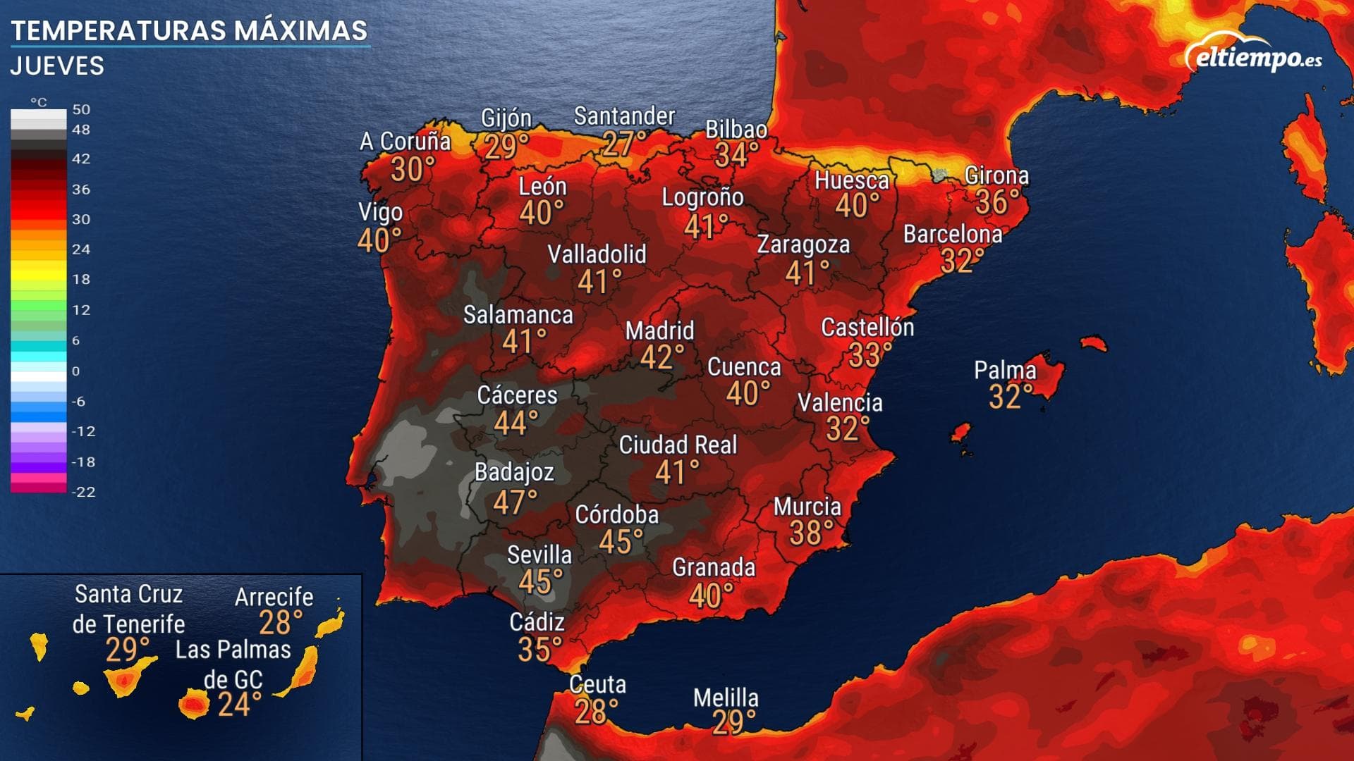 Températures maximales prévues en Espagne pour le jeudi 14 juillet 2022 - via ElTiempo.es