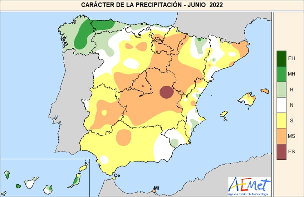 Si la France a bénéficié d'un mois de juin 2022 humide en raison de nombreux orages, ce ne fut pas vraiment le cas de l'Espagne où seules les régions du nord-ouest du pays ont profité d'un mois bien arrosé. De vastes régions du sud, du centre et de l'est du territoire ont subi un nouveau déficit pluviométrique. Or, la sécheresse ne date pas d'hier en Espagne et au Portugal où le déficit thermique est très important depuis le début de l'hiver dernier. Côté espagnol, juin 2022 fut également très chaud dans le nord et l'est du pays.