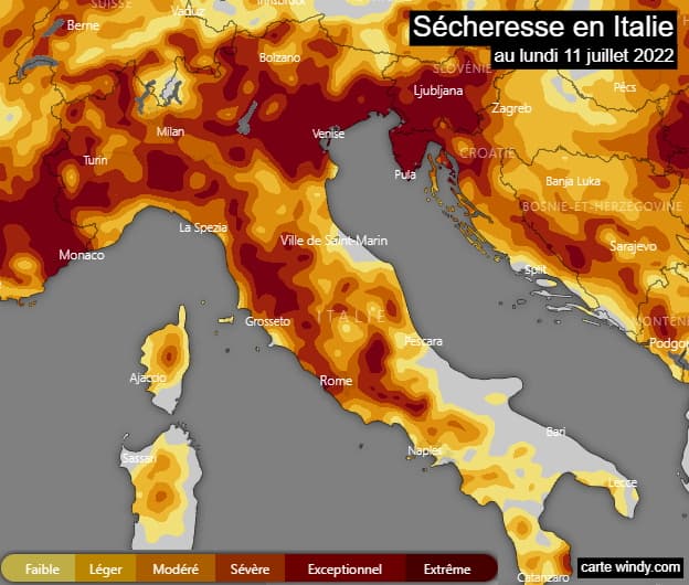 Sécheresse superficielle des sols en Italie au lundi 11 juillet 2022 - via windy.com