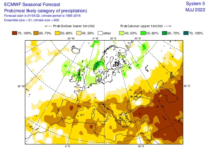 Le modèle européen, quant à lui, n'est pas vraiment plus optimiste. La projection des anomalies pluviométriques sur le trimestre à venir (mai, juin et juillet 2022) fait ressortir une anomalie sèche sur la France, plus nette sur les régions de la moitié sud. Cette vaste anomalie sèche engloberait tout le sud de l'Europe et le bassin méditerranéen.