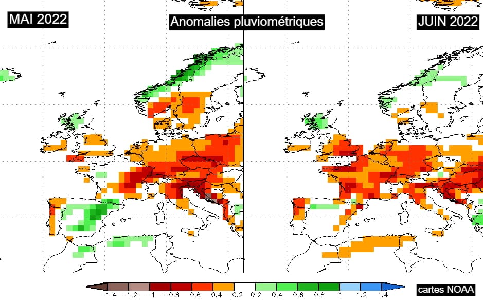 Anomalie pluviométrique sur mai et juin 2022 selon le modèle américain - via NOAA