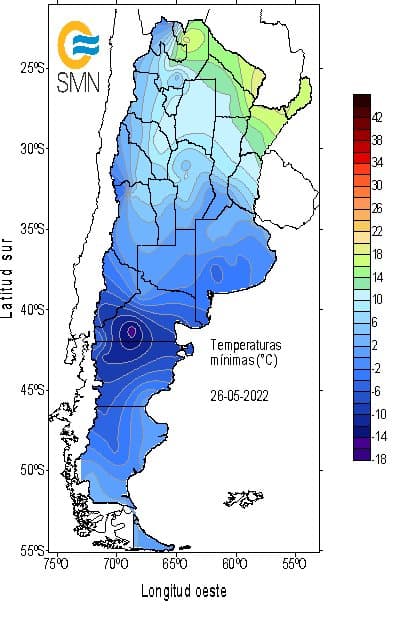 Températures minimales observées le 26 mai 2022 en Argentine - Via Twitter @SMN_Argentina
