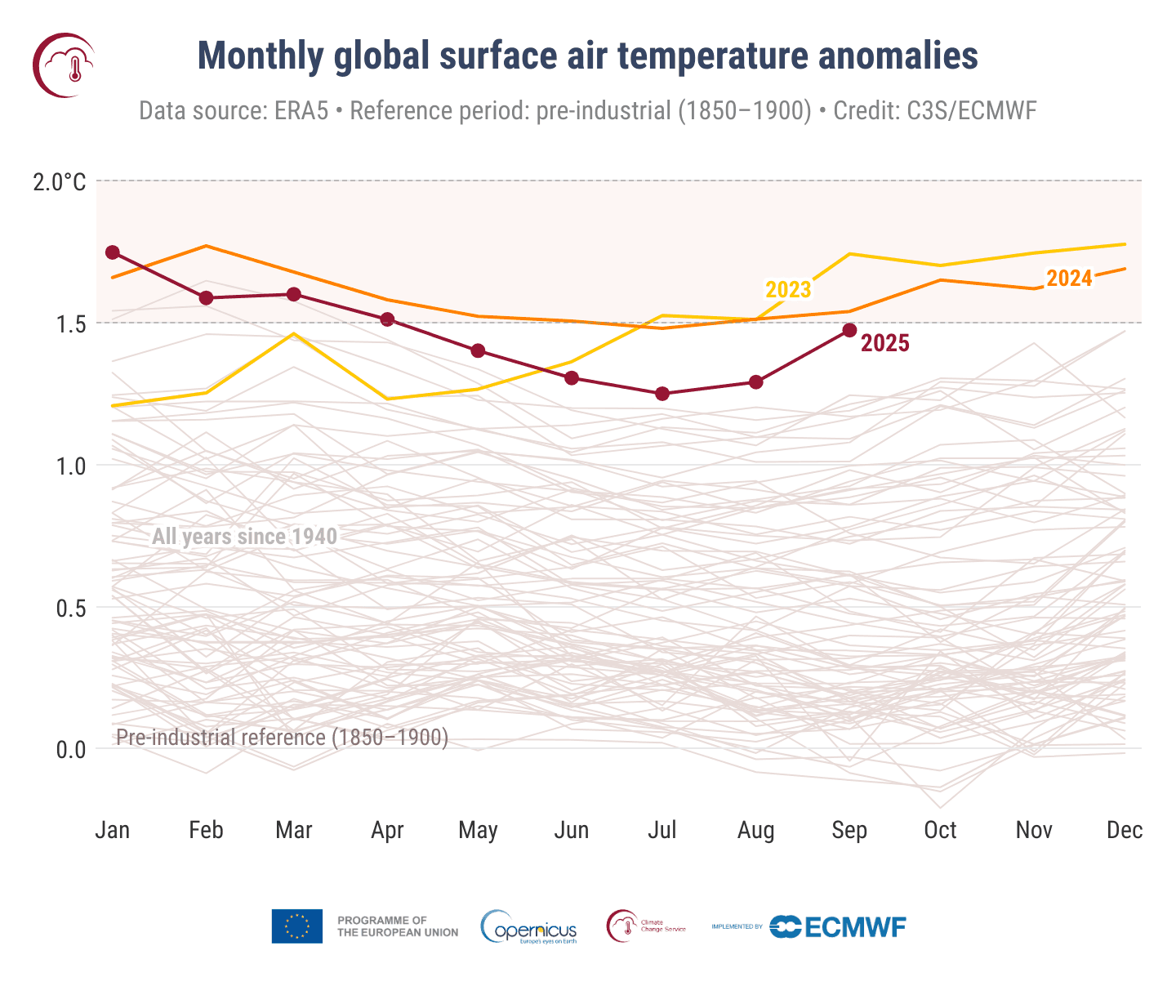 Anomalies mensuelles dans le monde de 1940 jusqu'à septembre 2025 - Copernicus