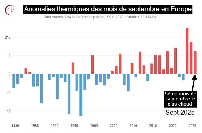 Si l'on considère le continent européen, la température moyenne de ce mois de septembre 2025 fut de 15,95°C. Cela représente une anomalie de +1,23°C par rapport à la moyenne de référence calculée sur la période 1991-2020. Ainsi, septembre 2025 se classe au 5ème rang des mois de septembre les plus chauds enregistrés en Europe depuis 1940. On est donc loin du bilan thermique français, même si les mois de septembre 2024 et surtout septembre 2023 avaient été encore plus chauds sur le vieux continent.