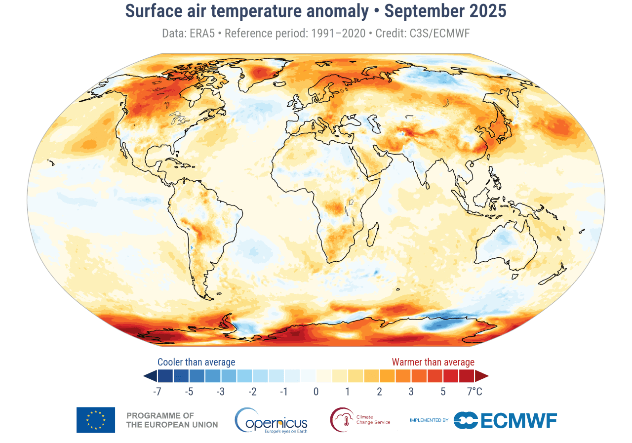 Anomalie thermique (normales 1991-2020) dans le monde au mois de septembre 2025 - Copernicus