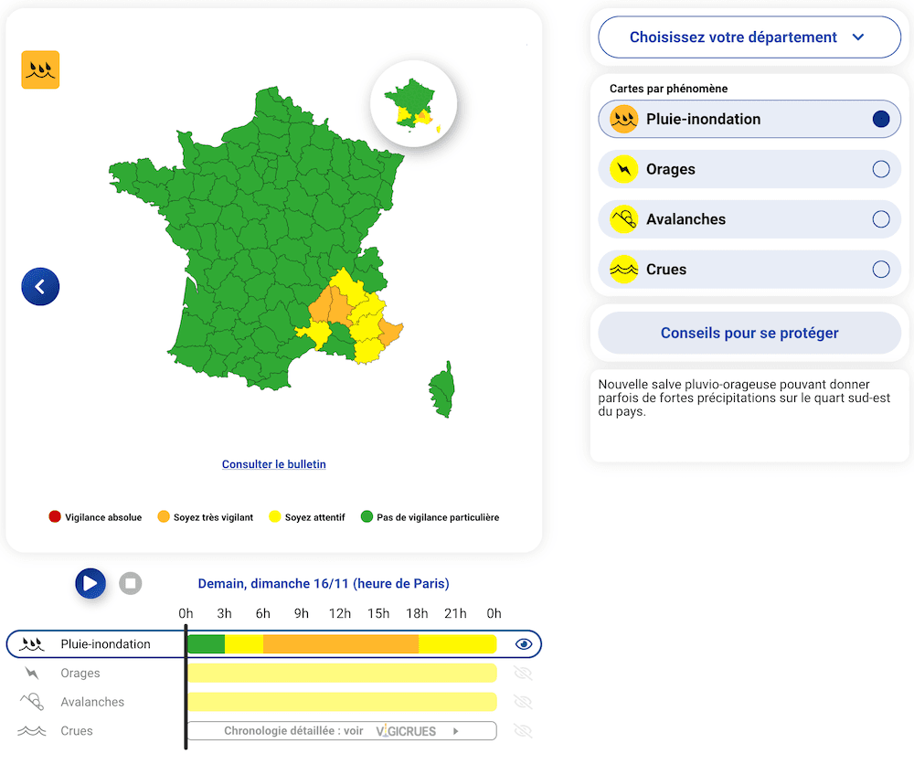 Compte tenu de la saturation des sols suite aux récentes précipitations abondantes, il est possible que certains cours d’eau présentent une réaction plus prononcée que samedi, notamment dans l’arrière-pays niçois et sur les Cévennes.  Par conséquent, plusieurs départements sont placés en vigilance jaune ou orange.