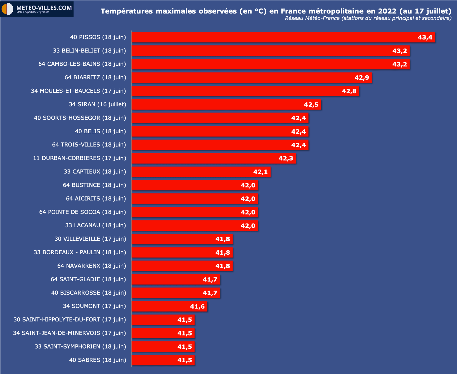 - 41.9°C à Belin-Beliet - Centre (33) : Record mensuel
