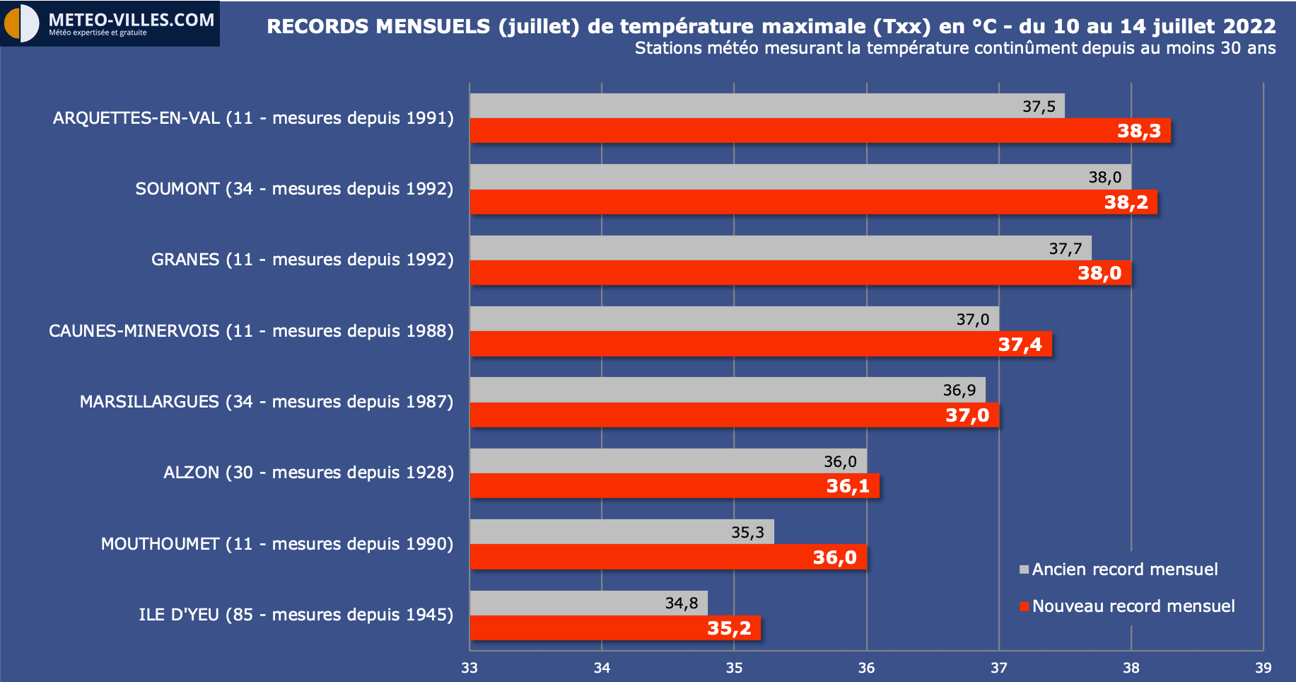- 23.1°C à Villefranche-de-Rouergue (12), battant les 23°C du 2 juillet 2015 (station ouverte en 1988)