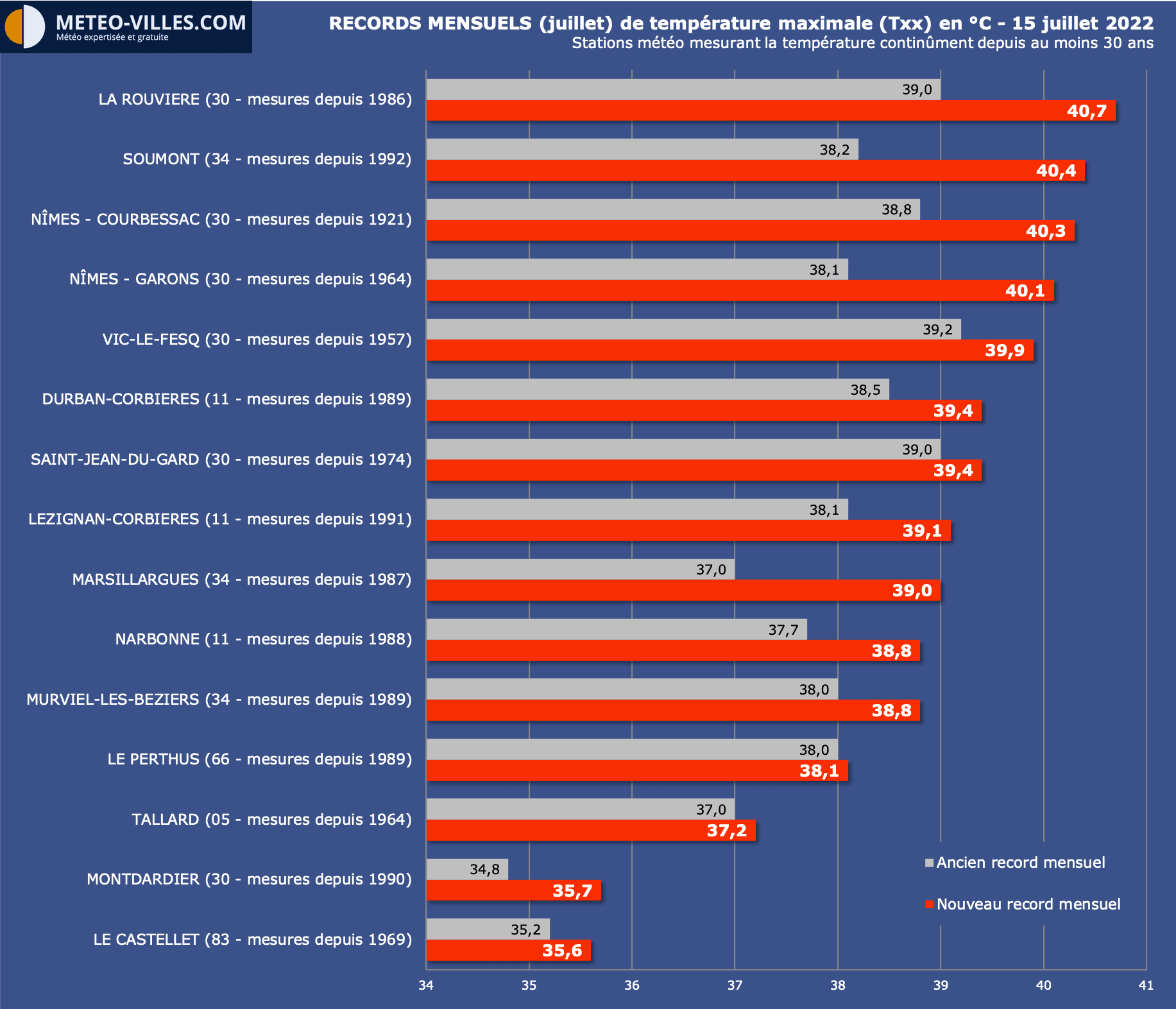 - 40.7°C à La Rouvière (Gard)