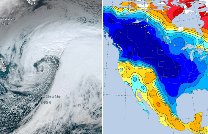 Nos voisins britanniques vivent une séquence particulièrement agitée. Une nouvelle tempête, nommée Jocelyn, frappera durant la nuit du mardi 23 au mercredi 24 janvier 2024. Moins puissante que la précédente, elle va tout de même générer des vents tempétueux sur le nord-ouest de l'Irlande et sur l'Écosse, placés en vigilance orange. En France, ce vent très fort se fera sentir sur l'extrême nord avec des rafales de 80 à 90 km/h dans les terres du Nord-Pas-de-Calais en nuit de mardi à mercredi. Comme le montre l'image ci-dessous, l'enroulement dépressionnaire de la tempête Jocelyn était particulièrement esthétique au dessus de l'Atlantique ce lundi 22 janvier 2024.