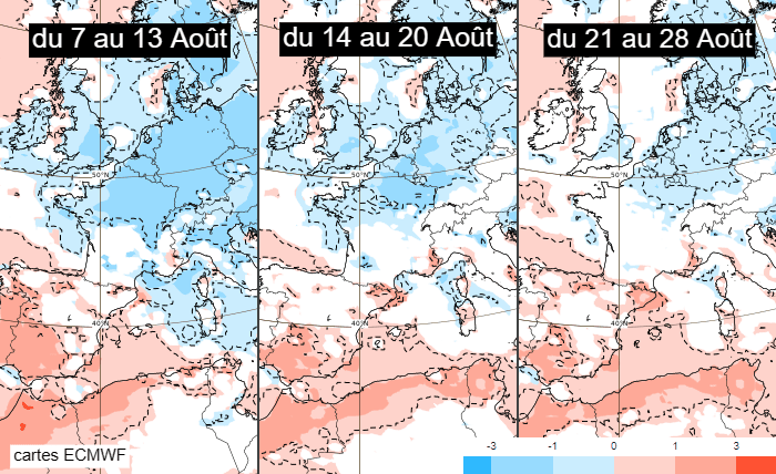 Selon le modèle européen, la relative fraîcheur serait au programme en semaine du 7 au 13 août 2023 mais celle-ci se prolongerait jusqu'en semaine du 14 au 20 août sur la moitié nord de la France, tandis que des valeurs de saison s'imposeraient au sud. Le modèle n'envisage pas véritablement d'anomalie thermique pour la fin du mois d'août, qui serait plus ou moins dans les normales.