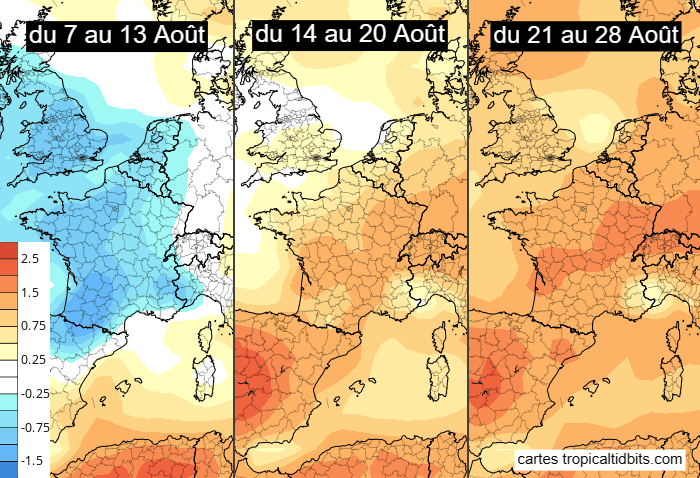 Projection des anomalies thermiques hebdomadaires en août 2023 - modèle américain via tropicaltidbits.com