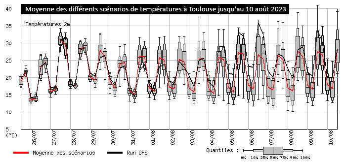 Moyenne des différents scénarios de température à Toulouse du 26 juillet au 10 août 2023 - via meteociel.fr