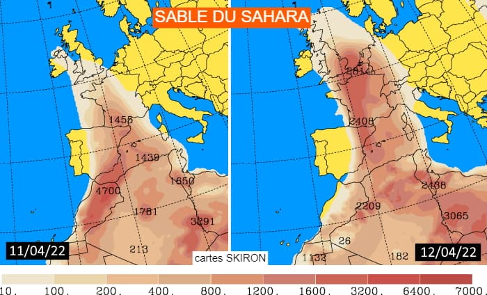 Concentrations de poussières de sable du Sahara les lundi 11 et mardi 12 avril 2022 - cartes SKIRON