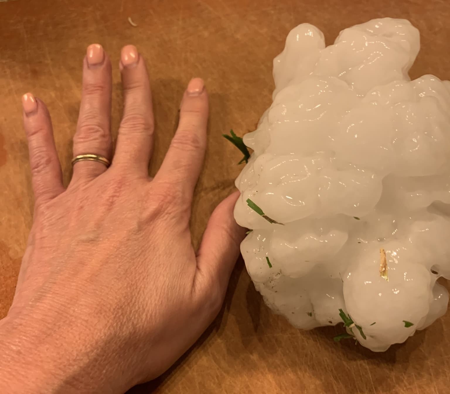Grêlon de 14 cm de diamètre tombé à Salado (Texas) le mardi 12 avril 2022 - photo Gina Brown