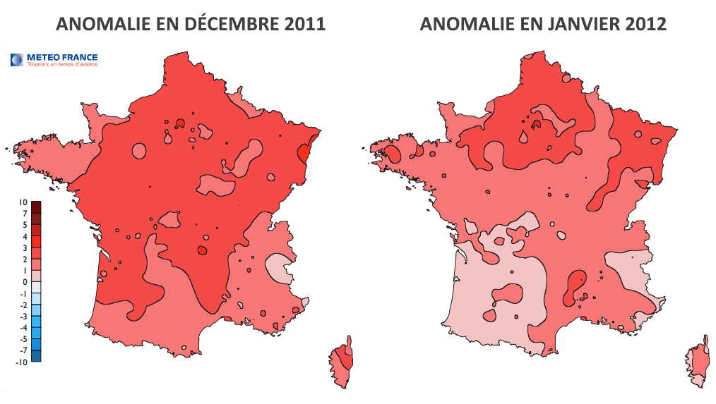 Anomalie thermique mensuelle en décembre 2011 et janvier 2012 - Météo France