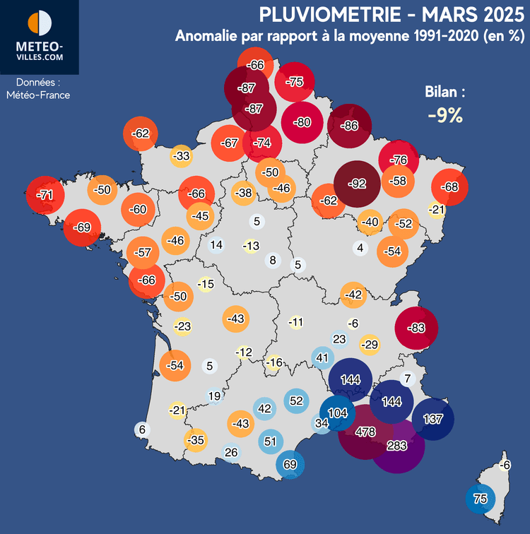 Anomalies mensuelles de précipitations sur la France de janvier à avril 2025 – Météo-Villes