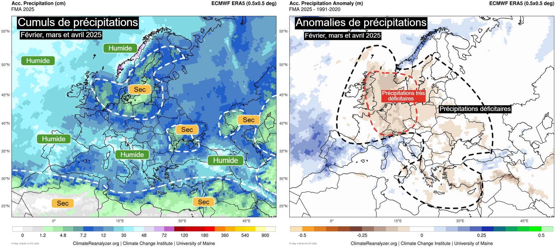 Cumul de précipitations et anomalies de précipitations sur l'Europe entre février, mars et avril 2025 – Via ClimateReanalyzer