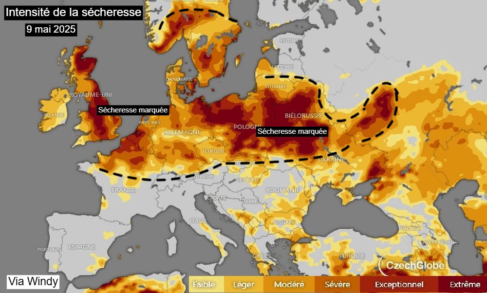 Intensité de la sécheresse des sols (0-100cm) sur l'Europe au 9 mai 2025 – Via Windy