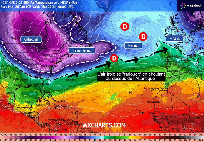 Cela s'explique tout simplement par l'Atlantique. Ses eaux sont en effet relativement douces, ce qui atténue grandement l'air froid lorsque celui-ci survole les milliers de kilomètres qui séparent la côte canadienne de la côte ouest européenne. Ainsi, il n'est pas possible qu'une telle masse d'air polaire se propage directement de l'Amérique du Nord vers l'Europe.