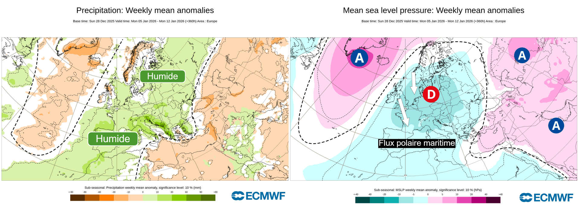 Anomalie de précipitations et de pressions pour la semaine du 5 au 11 janvier sur l'Europe – ECMWF