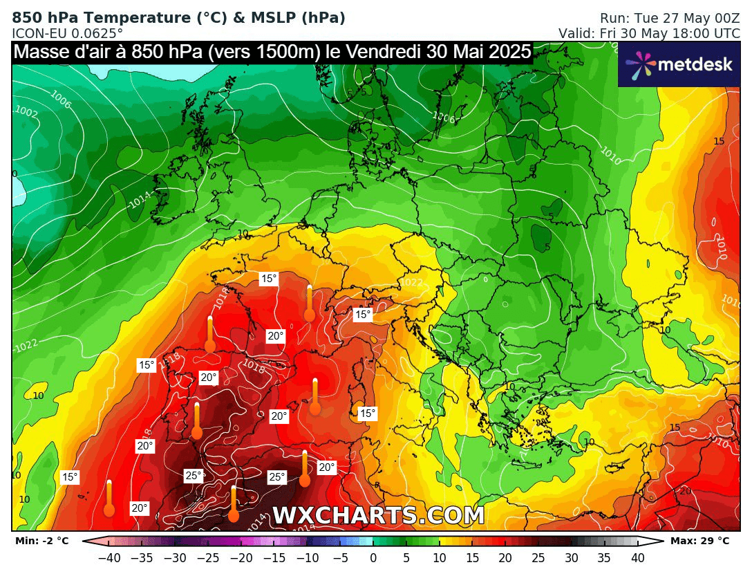 La carte ci-dessous montre la température de la masse d'air prévue le vendredi 30 mai 2025, vers 1500 mètres d'altitude. On constate qu'elle dépassera les 15°C sur les 3/4 de la France et les 20°C dans le sud-ouest, des niveaux impressionnants et dignes des vagues de chaleur survenant au cœur de l'été ! Dans le centre et le sud de l'Espagne, des températures de 23-24°C sont modélisées à 850 hPa ! Cet air très chaud remonte directement d'Afrique.