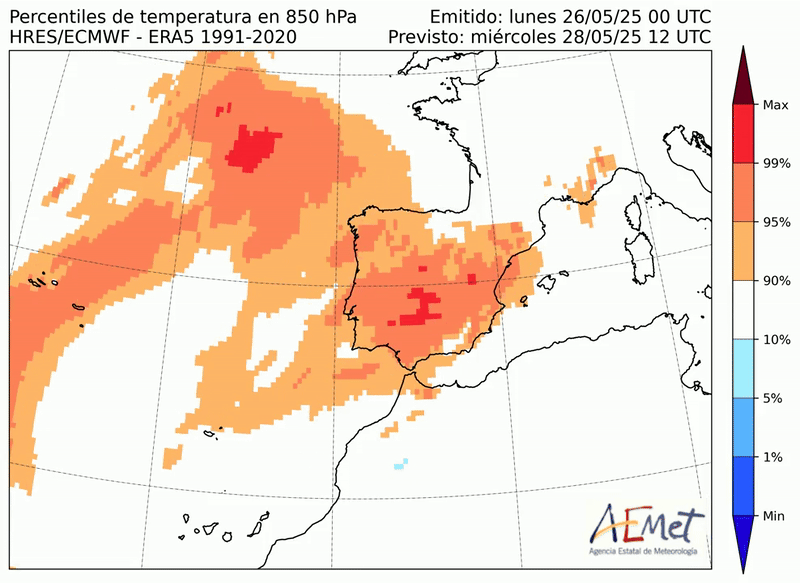 L'animation ci-dessous permet de mesurer plus distinctement le caractère exceptionnel de cette masse d'air chaude. Sur le sud de la France et notamment sur l'Espagne, la température de la masse d'air se situera dans le 1% des niveaux les plus chauds observés fin mai (couleur rouge), atteignant parfois les niveaux records historiques (rouge foncé) durant les journées des jeudi 29 et vendredi 30 mai 2025 ! C'est en Espagne que cette vague de chaleur sera la plus remarquable.