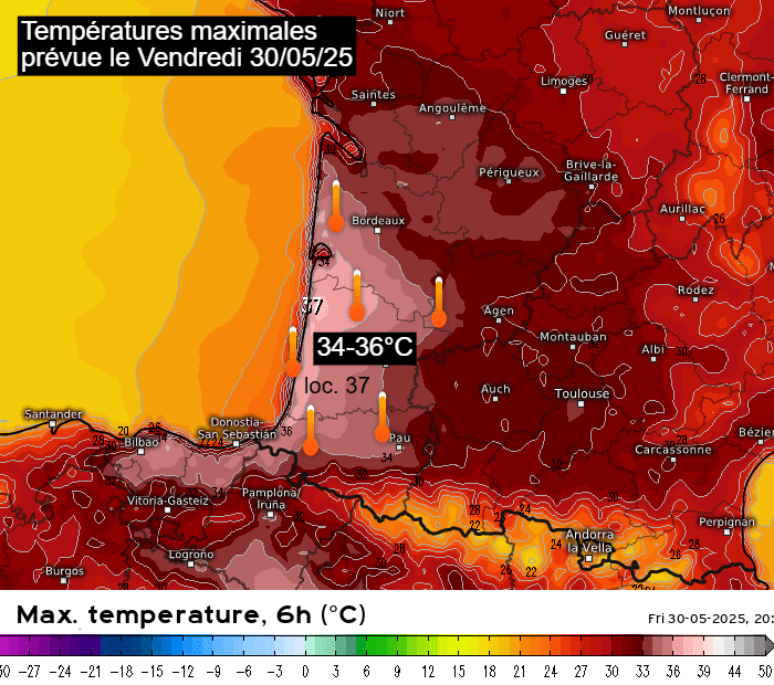 Comme évoqué, le pic de chaleur se produira le vendredi 30 mai 2025 dans le sud-ouest de la France et plus particulièrement en Aquitaine. Entre les Pyrénées-Atlantiques, les Landes et la Gironde, le thermomètre devrait grimper fréquemment entre 34 et 36°C ! Certaines modélisations envisagent des pointes à 37°C dans l'ouest des Landes, comme le montre la carte ci-dessous issue du modèle allemand. Ces valeurs sont remarquables fin mai !