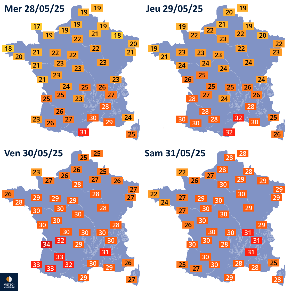 Températures maximales prévues du mercredi 28 au samedi 31 mai 2025 - Météo Villes