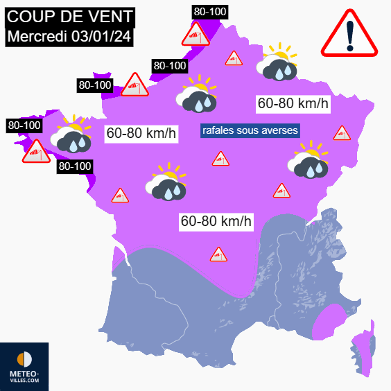 La journée du mercredi 3 janvier 2024 restera agitée sur une bonne moitié nord de la France avec la mise en place d'un ciel de traîne actif produisant de fortes averses. Celles-ci seront ponctuées de fortes rafales de vent, pouvant atteindre 60 à 80 km/h sur toute la moitié nord ainsi qu'aux abords du Massif Central. Près des côtes bretonnes et de la Manche ainsi que sur l'extrême nord, des rafales de 80 à 100 km/h seront possibles au passage des plus fortes averses. Contrairement à mardi, le vent moyen sera moindre et les bourrasques les plus notables seront associées au passage des averses.