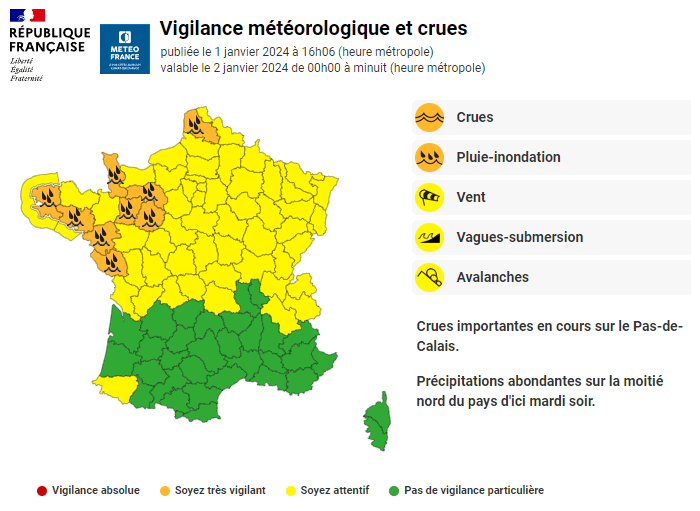 Carte de vigilance valable pour le mardi 2 janvier 2024 - Météo France