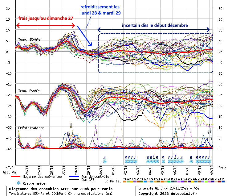 Différents scénarios du modèle américain pour Paris du 23 novembre au 9 décembre 2022 - via meteociel.fr