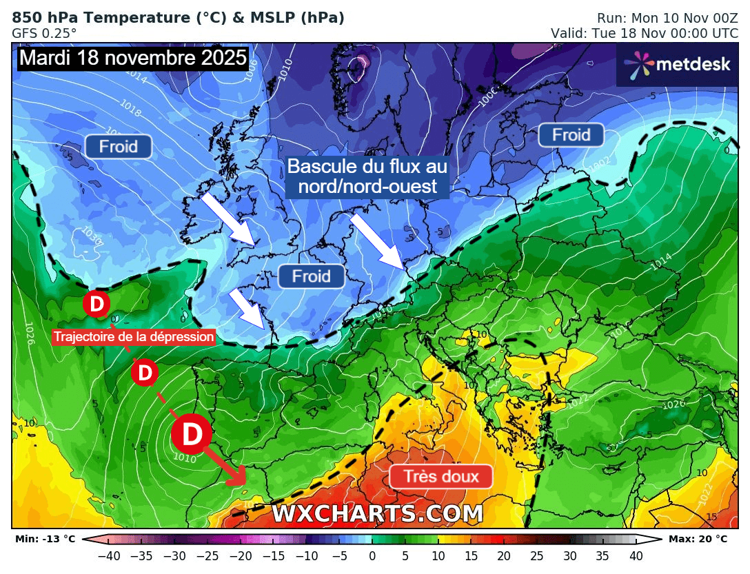En effet, la situation va devenir favorable à un changement général de flux en Europe à partir du début de semaine prochaine. La zone dépressionnaire responsable du coup de douceur de cette semaine devrait en effet peu à peu plonger vers l'Afrique du nord et les régions méditerranéennes à partir du week-end, entraînant une bascule du flux en altitude et donc le retour d'un air plus froid et hivernal sur une large partie du continent.