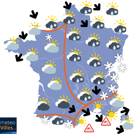 En effet dès ce jeudi 24 décembre de l’air froid va rapidement s’engouffrer sur le pays lors du basculement du flux au Nord-Ouest à l’arrière du front glissant peu à peu vers le Sud.