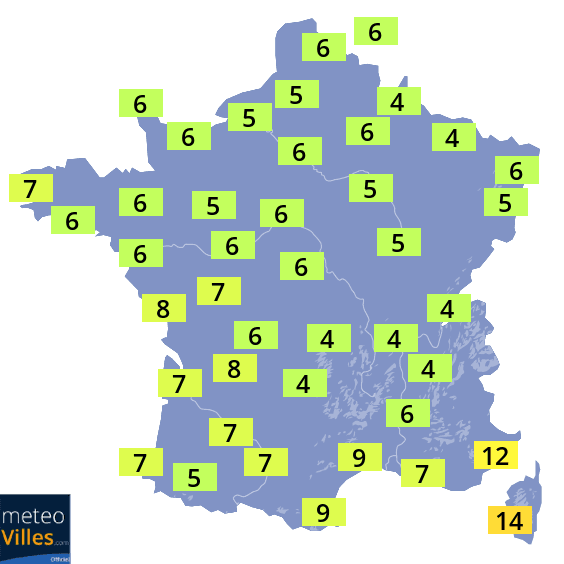 De ce fait, les températures vont retrouver des valeurs bien hivernales sur de nombreuses régions pour le jour de Noël avec même un risque de giboulées et de neige à basse altitude sur le Nord et l'Est du pays. On ne dépassera pas 3 à 5°C le 25 décembre du Centre-Est au Nord/Nord-Est. Nous relèverons en général 5 à 7°C sur le reste des régions du Nord et du Sud-Ouest et seule la méditerranée retrouvera localement des valeurs supérieures à 10°C.