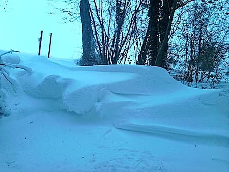4e épisode neigeux en 4 jours dans l’Essonne le 20 décembre et congères de plus de 1 m de dans l’Aisne où 90 % des routes sont bloquées le 23 décembre – Via infoclimat.fr et Météo-Villes