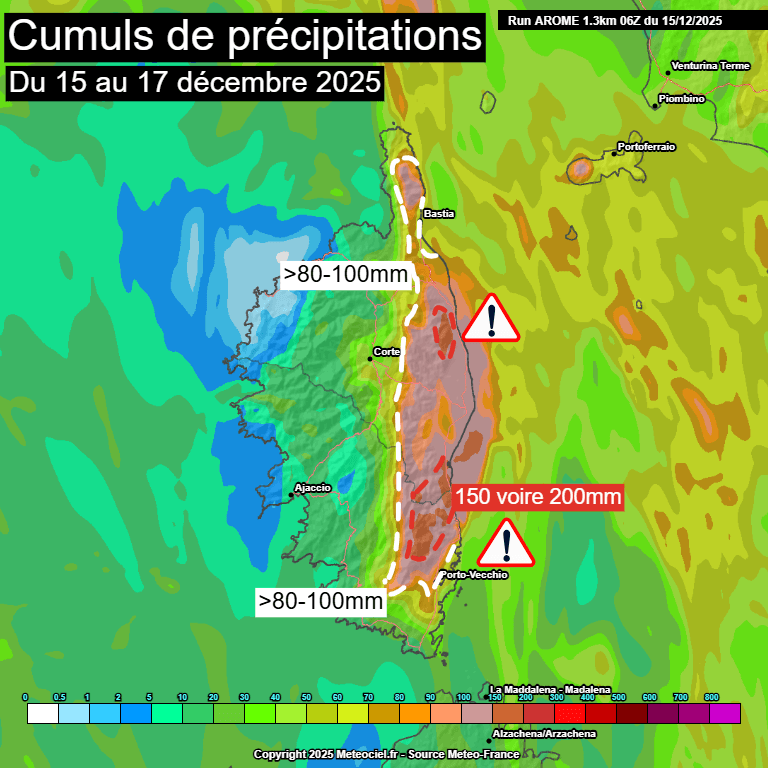 Entre ce soir et demain mardi, de fortes précipitations orageuses vont également concerner la Corse et notamment l'est de l'île. Sur ce secteur, les remontées très humides et instables pourront apporter des cumuls de 80 à 100mm sur de larges zones, parfois plus de 150 voire 200mm sur les secteurs les plus exposés, laissant craindre un risque d'inondations locales.