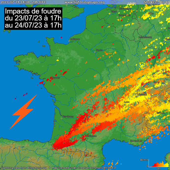 Éclairs enregistrés du dimanche 23 juillet à 17h au lundi 24 juillet 2023 à 17h - via lightningmaps.org