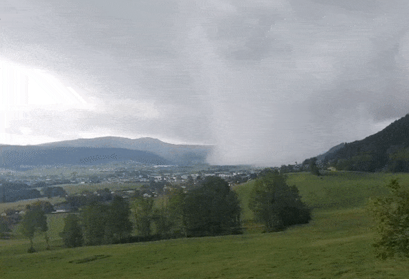 Les images ci-dessous ont été tournées à Montlebon dans le Doubs au moment de l'arrivée de l'orage en fin de matinée de lundi. Elles sont riches d'enseignement quant à la nature potentielle du phénomène. En effet, on observe une colonne de précipitations très dense projetée vers le sol, symptomatique des rafales descendantes (micro-rafales ou macro-rafales). Celles-ci peuvent être particulièrement violentes et causer de lourds dégâts, même si des enquêtes de terrain seront nécessaires pour vérifier s'il n'y a pas eu une tornade cachée dans ce rideau de précipitations.