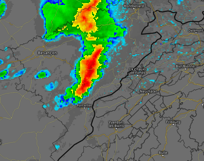 Images radar de l'orage dévastateur entre Doubs et Suisse en fin de matinée du lundi 24 juillet 2023 - via meteologix.com