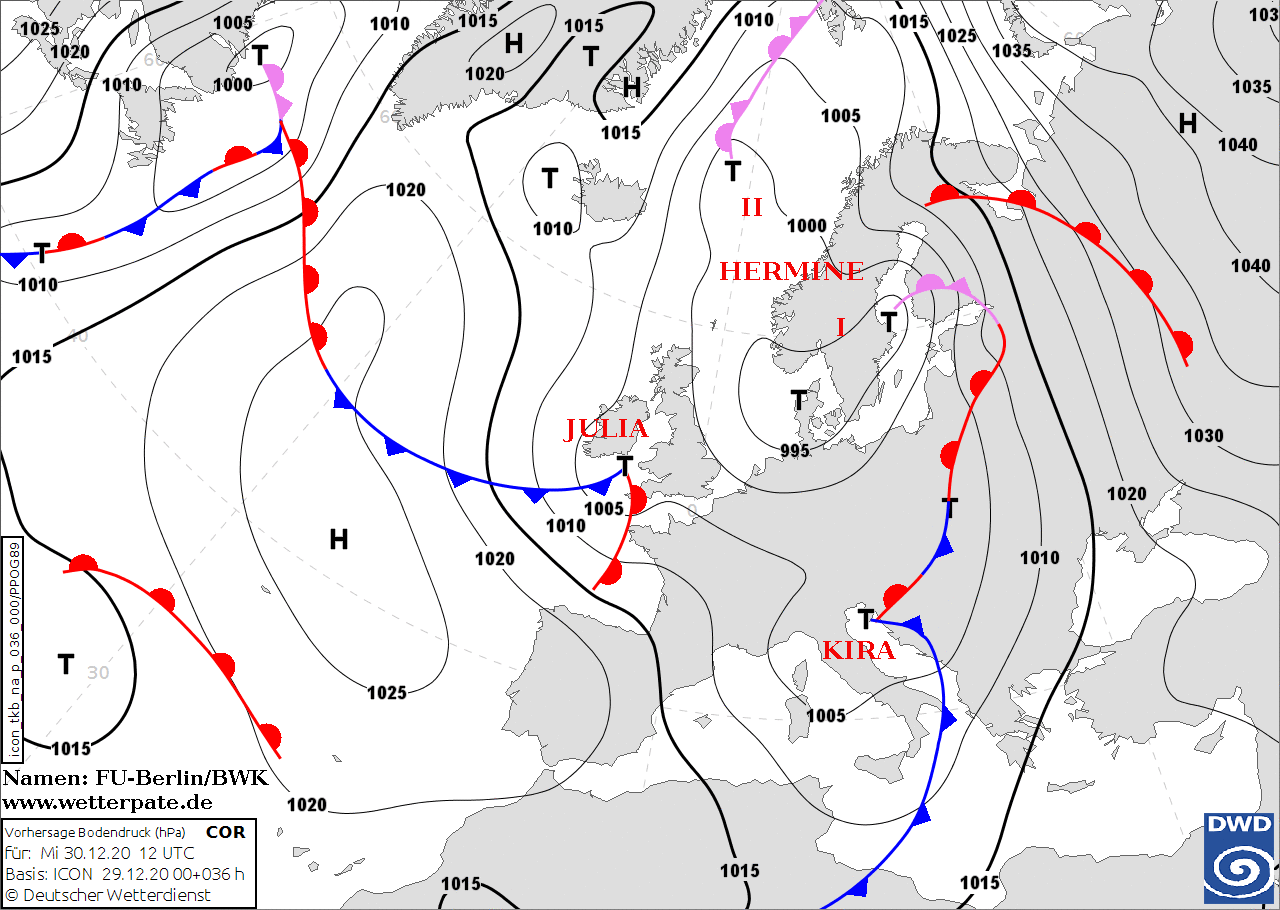 Noms des dépressions et anticyclones prévus pour mercredi 30 décembre 2020 à midi (Berlin)