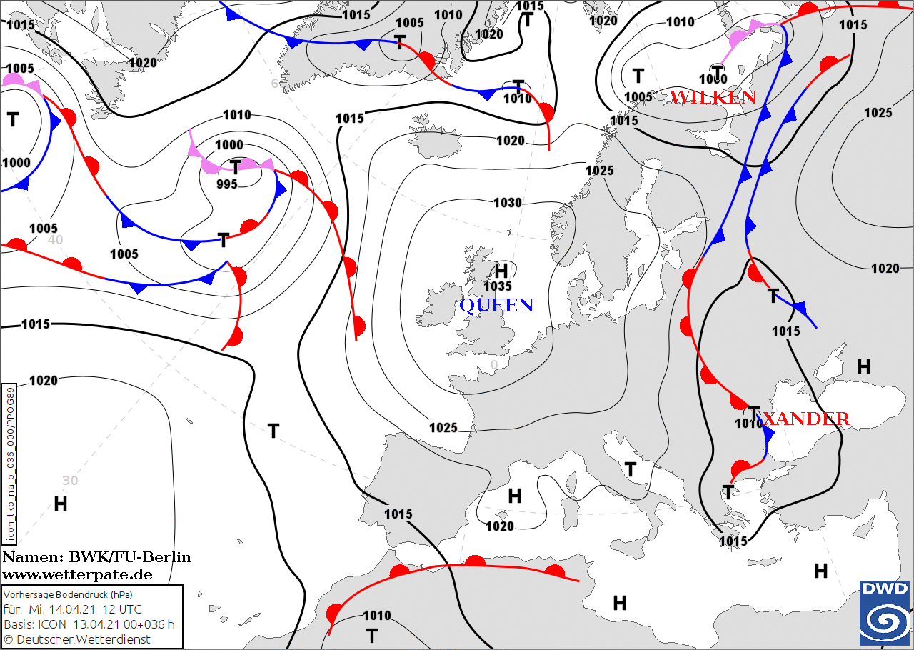 Noms des dépressions et anticyclones prévus pour mercredi 14 avril 2021 à midi (Berlin)