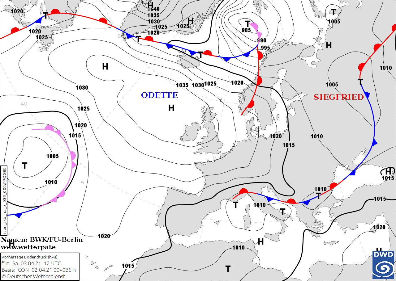 Noms des dépressions et anticyclones prévus pour samedi 3 avril 2021 à midi (Berlin)