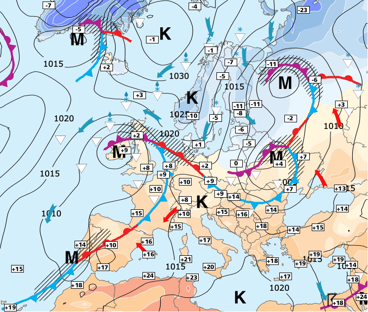 + Cette dépression aura pour effet de repousser l'air froid scandinave vers la mer du Nord.