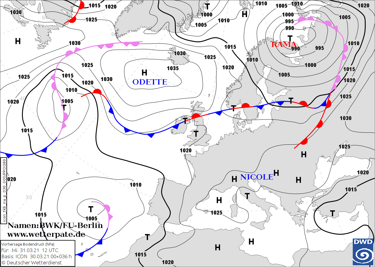 Noms des dépressions et anticyclones prévus pour mercredi 31 mars 2021 à midi (Berlin)
