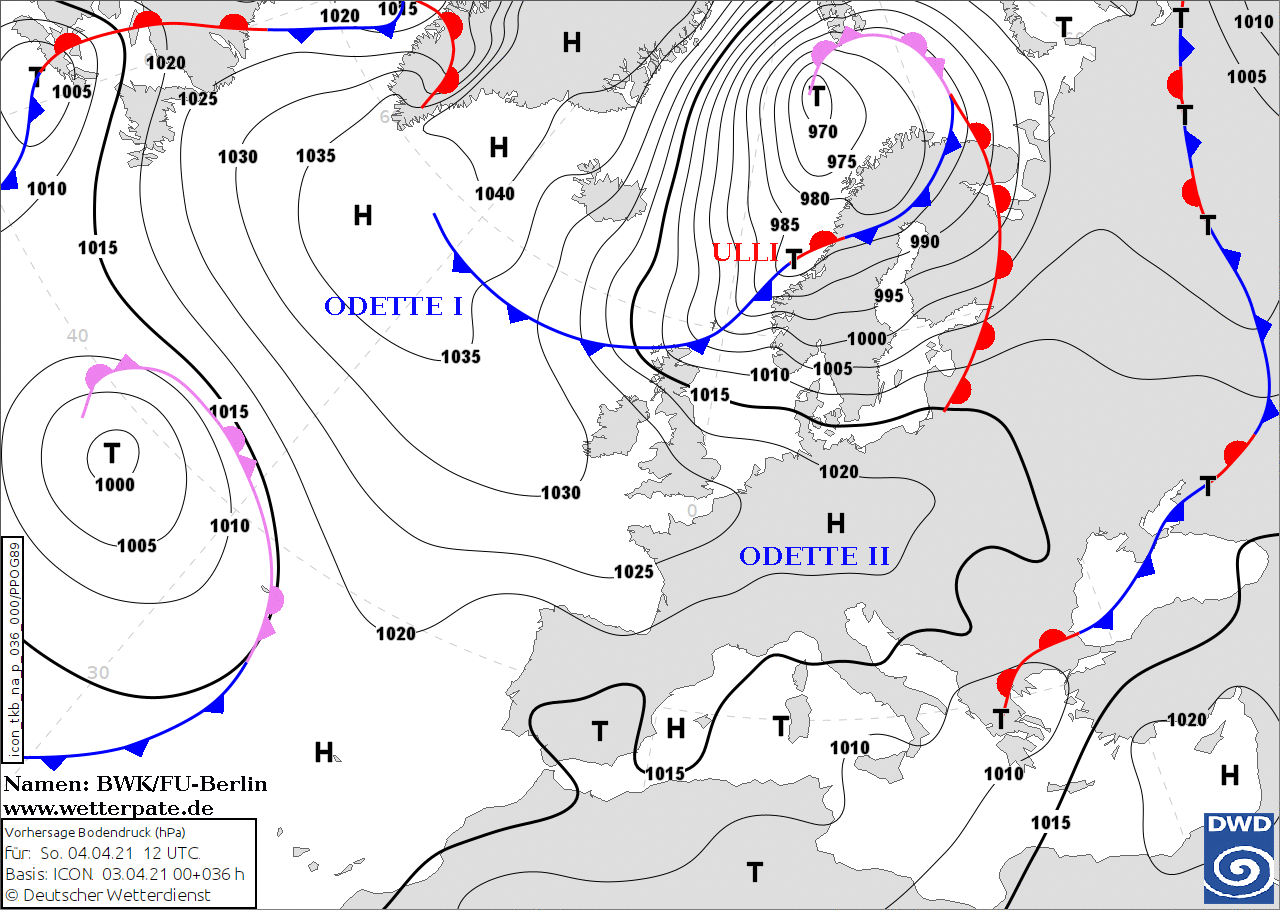 Noms des dépressions et anticyclones prévus pour dimanche 4 avril 2021 à midi (Berlin)