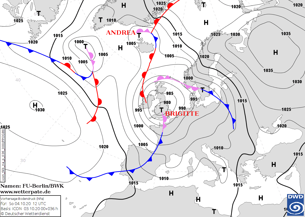 Noms des dépressions et anticyclones prévus pour dimanche 4 octobre 2020 à midi (Berlin)